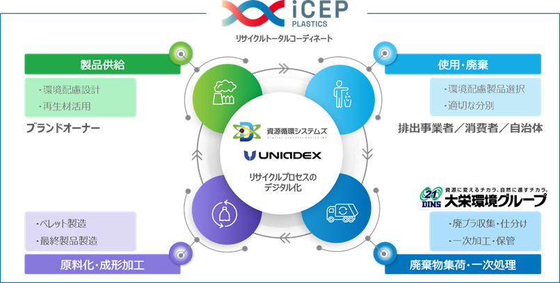 大栄環境株式会社、資源循環システムズ株式会社、株式会社八木熊、株式会社ユニアデックスの4社により、各社の強みを活かした廃プラスチックの回収・再生樹脂化・成形加工・製品化をワンストップで提供し企業のリサイクルスキームの構築を支援